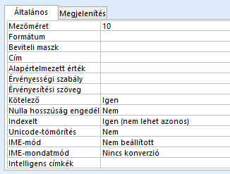 A választott mezőnek vannak tulajdonságai. Ezeket is be kell állítani.